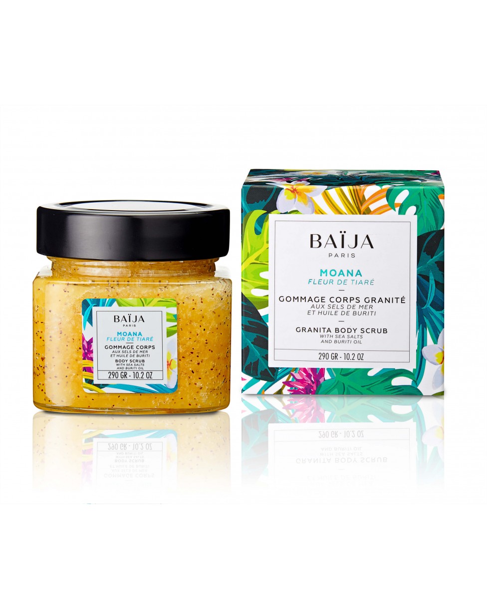 Das Baija Peeling 'Moana' enthält Meersalz und das feine Pulver gemahlener Sheabutternüsse. Sonnenblumen-, Jojoba- und Kokosöl verwöhnen die Haut und machen sie samtweich.