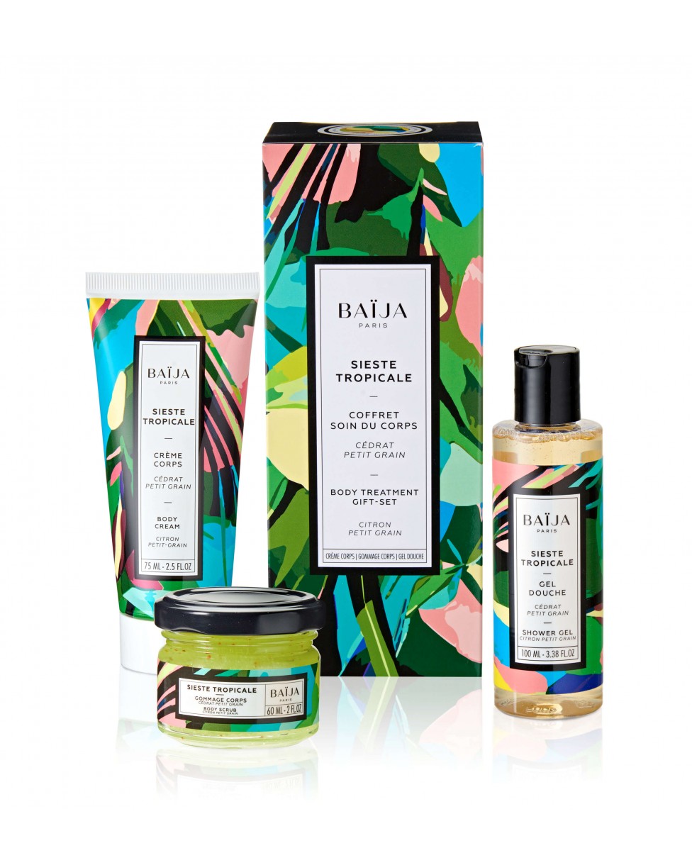 Im Set vereint sind drei Produkte von Baija: ein Peeling mit gemahlenen Traubenkernen, und Orangenblütenwasser, eine nährende Körpercreme und ein mildes Duschgel. Die sich ergänzende Pflege wird begleitet vom Duft einer tropischen Siesta. Die handlichen, farbenfrohen Verpackungen machen Freude zum Mitnehmen oder zum Verschenken.