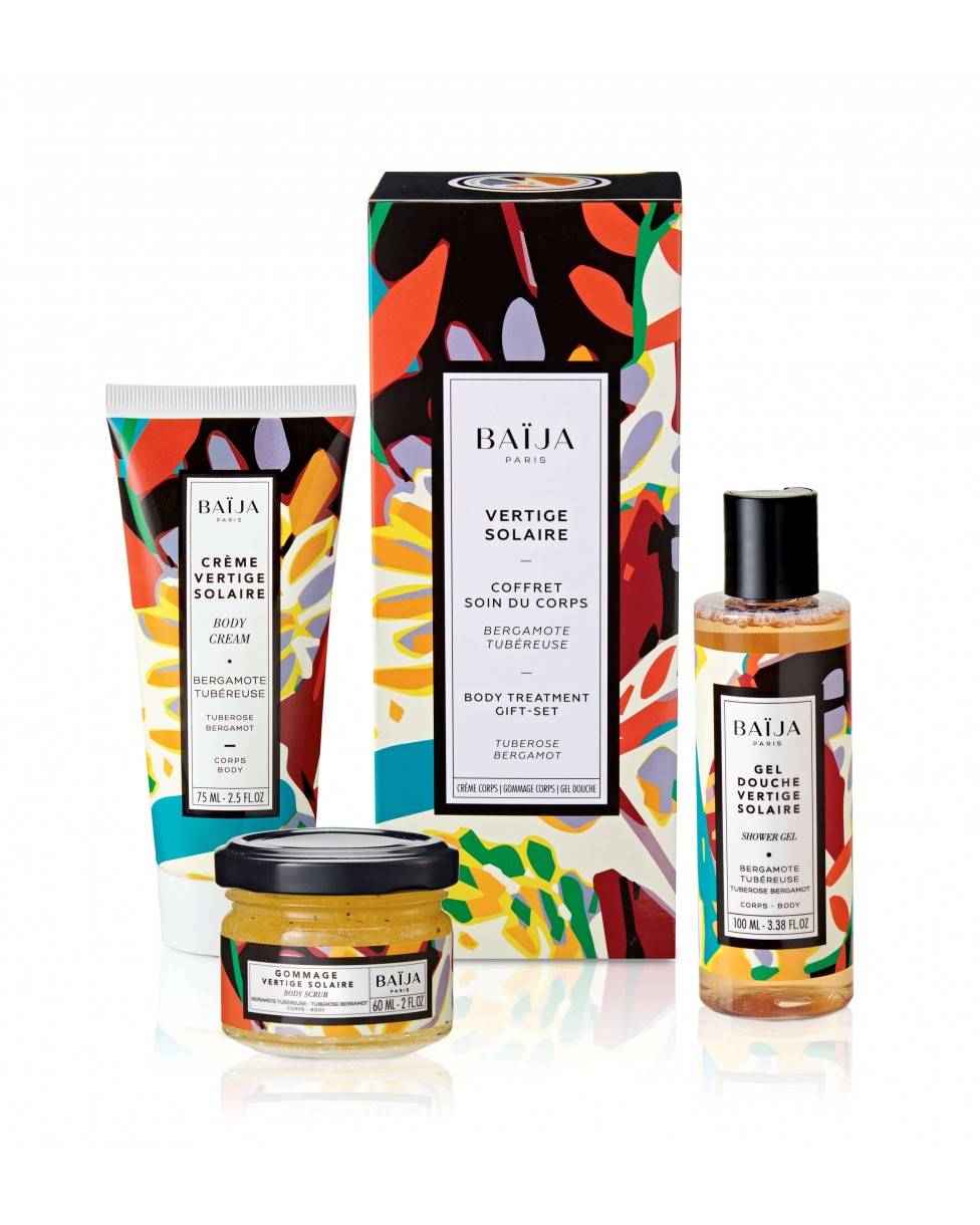Im Set vereint sind drei Produkte von Baija: ein Peeling mit beruhigendem Hamameliswasser, Passionsfruchtsamen und Pflanzenöl, eine reiche Körpercreme mit vier verschiedenen Ölen und ein nährendes, mildes Duschgel. Alles begleitet vom feinen Duft der Bergamotte. Die handlichen, farbenfrohen Verpackungen machen Freude zum Mitnehmen oder zum Verschenken.