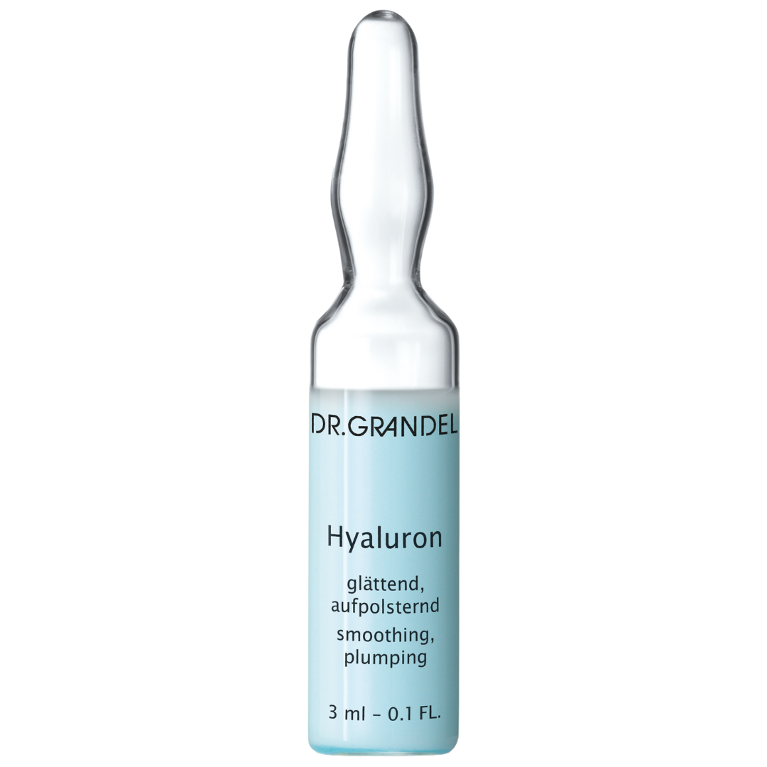 Mit der 'Hyaluron' Ampulle werden Trockenheitsfältchen gezielt von innen aufgepolstert und deutlich gemildert. Ein absoluter Feuchtigkeits-Booster mit Falten-Füller-Effekt.