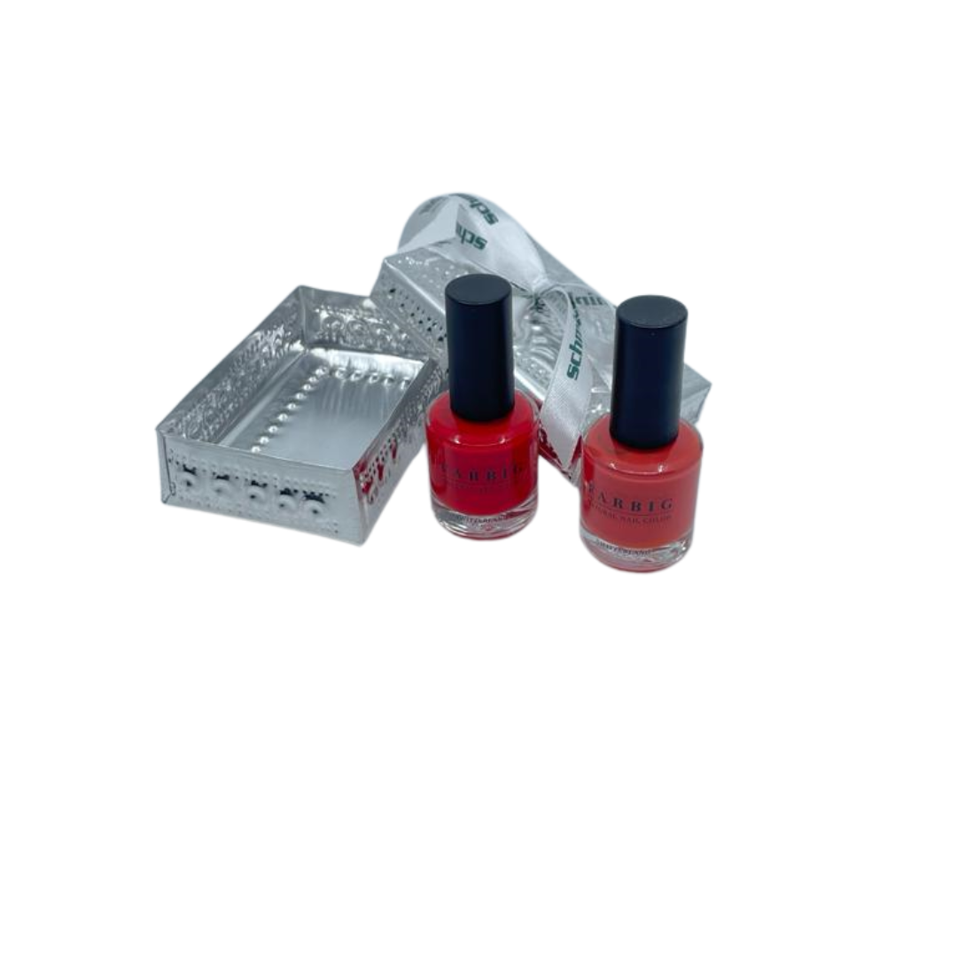 Im handgestanzten Alu-Böxli paaren sich die beiden f a r b i g Nagellacke 'Sina Salsa' und 'Karlie Karmin'. Ein schönes Paar, nicht wahr? Zumal Sie kaum einen besseren Nagellack verschenken können: die 18free Formel ist unschlagbar in der Haltbarkeit, vegan und ein Schweizer Produkt. Wer mag kräftige Rottöne?