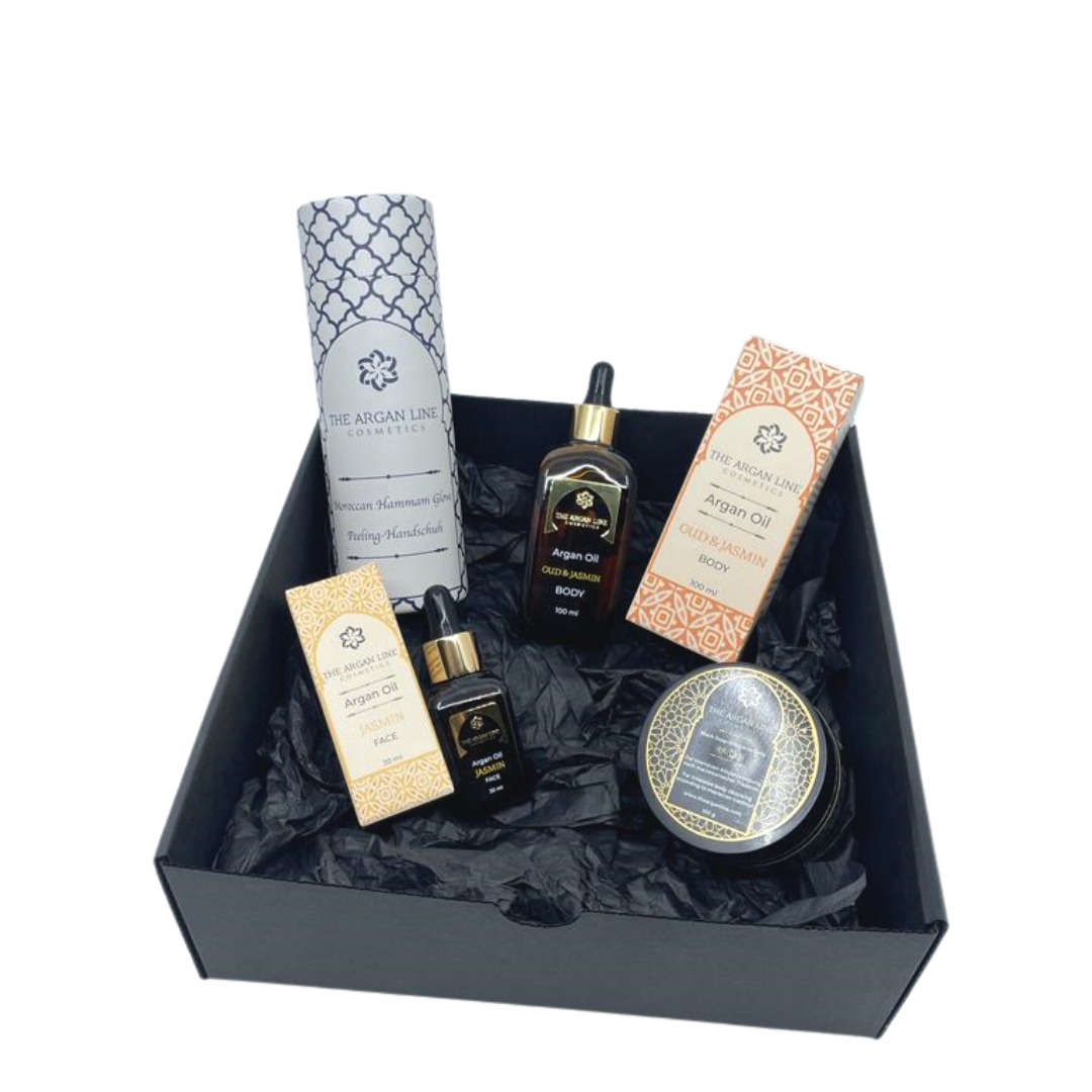Die luxuriöse Orient-Box 'Jasmin' de Luxe enthält ein Argan Gesichtsöl und ein Körperöl, beide mit dem Duft von Jasmin angereichert, beim Körperöl zusätzlich Oud, was alles ein bisschen geheimnisvoll und verführerisch macht. Mit dem Hammam Handschuh kann die schwarze Seife, welche Bestandteil des Hammam Rituals ist, wieder abgewaschen werden. Alles passt zusammen, ist tief nährend und die Öle legen sich wie ein Schutz auf die Haut.