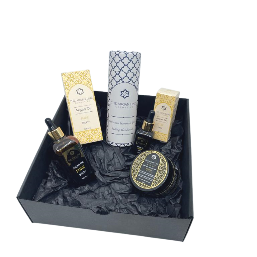Die luxuriöse Orient-Box 'Pure' de Luxe enthält ein Argan Gesicht- und Körperöl von The Arganline, welche beide tief nährend und voller Antioxidantien sind. Mit dem Hammam Handschuh kann die schwarze, reinigende Seife, welche Bestandteil des Hammam Rituals ist, wieder abgewaschen werden. Alles passt zusammen und die Öle legen sich wie ein Schutz auf die Haut.