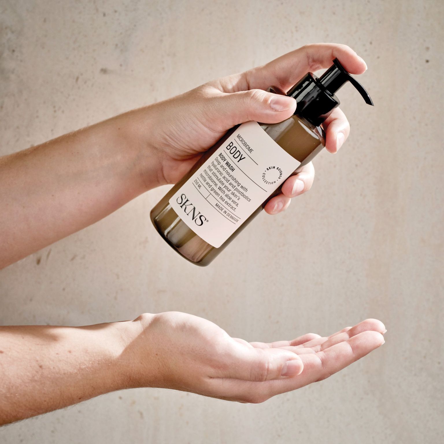 Das Body Wash von SKNS sorgt für tiefe und nährende Sauberkeit mit Hyaluronsäure und Postbiotika und stimuliert so das hauteigene Mikrobiom, welches wiederum die natürliche Balance der Haut fördert. Enthält Aloe Vera, Brennnessel und Grüntee.